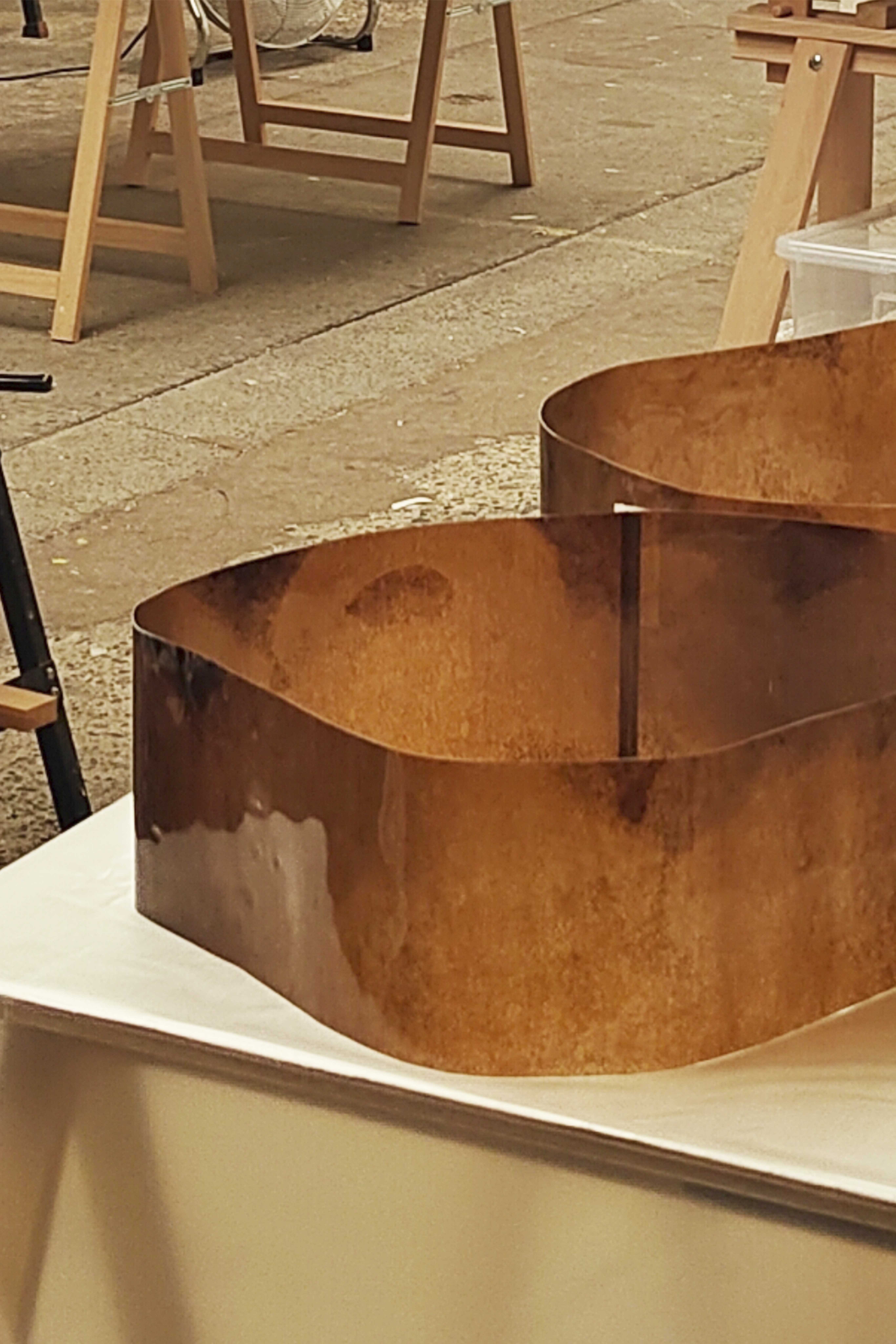 To respect the lifespans of the materials and allow for dismantling, we developed metal horseshoes that hold the paper curves in place without permanent fixation. While the strong paper structures support the heavy stone top, the stone (Pierre de Muzillac) adds its own weight and stability in return.